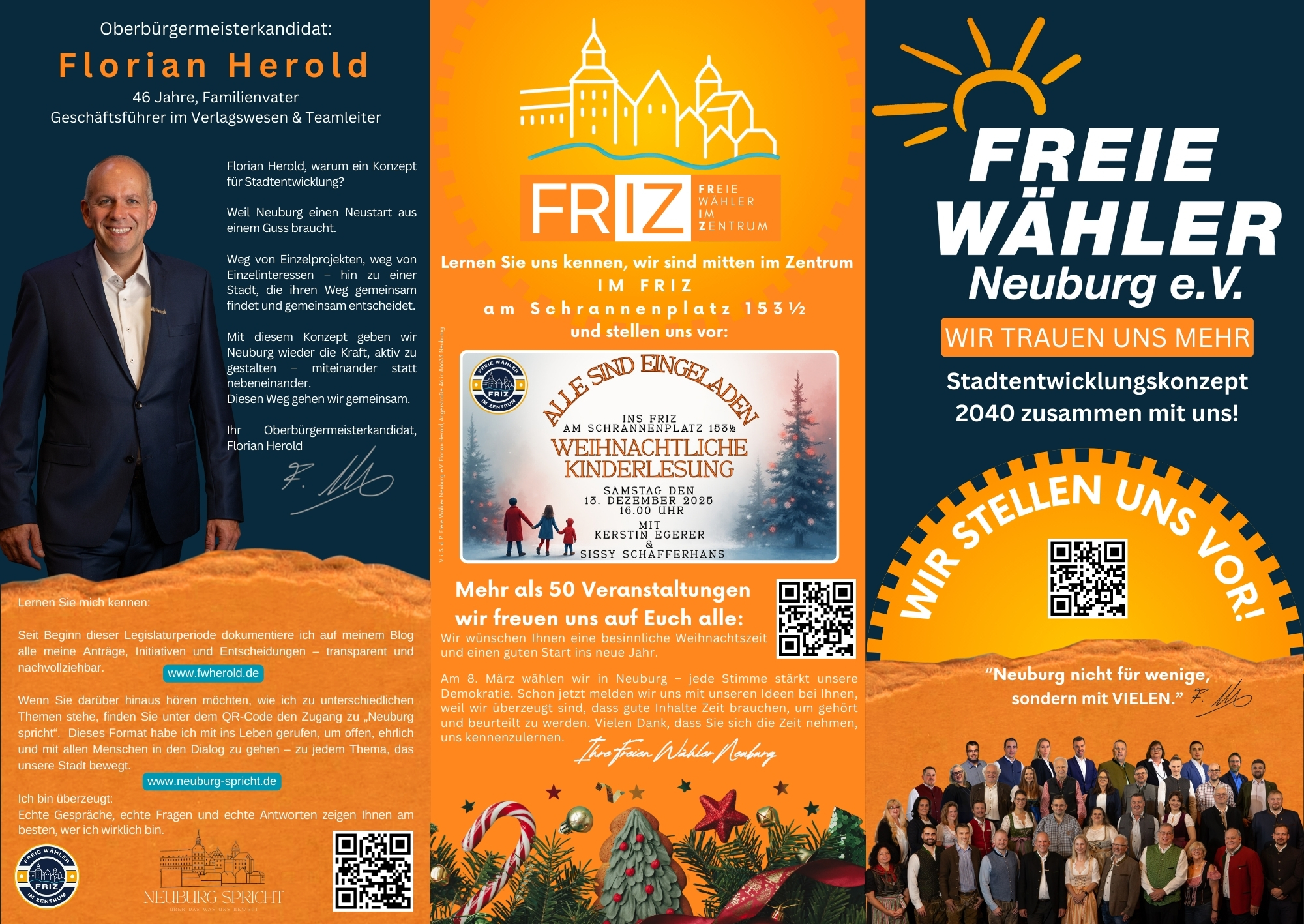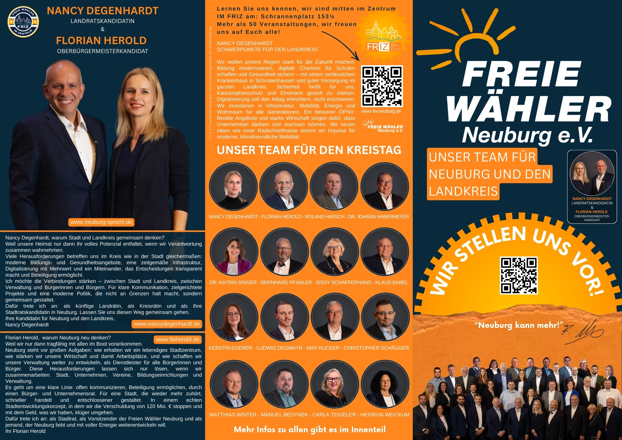 die FREIEN WÄHLER Neuburg e.V. starten im Dezember offiziell in den Kommunalwahlkampf. Rund zehn Wochen bevor die Briefwahlunterlagen versendet werden, möchten wir uns als gesamtes Team vorstellen: mit unseren Stadtratskandidatinnen und -kandidaten, unserer Landratskandidatin und Oberbürgermeisterkandidaten Florian Herold.