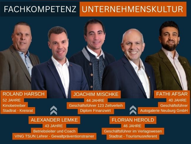 Wir wollen uns in den Dienst dieser Stadt stellen und Neuburg in ein wirtschaftsnahes, finanziell solides und langfristiges Stadtentwicklungskonzept überführen. Ein Konzept, das echte Handlungsspielräume schafft – ohne große Neuverschuldung. Viele haben Ideen für Neuburg. Die entscheidende Frage lautet jedoch: Wie wird das finanziert?